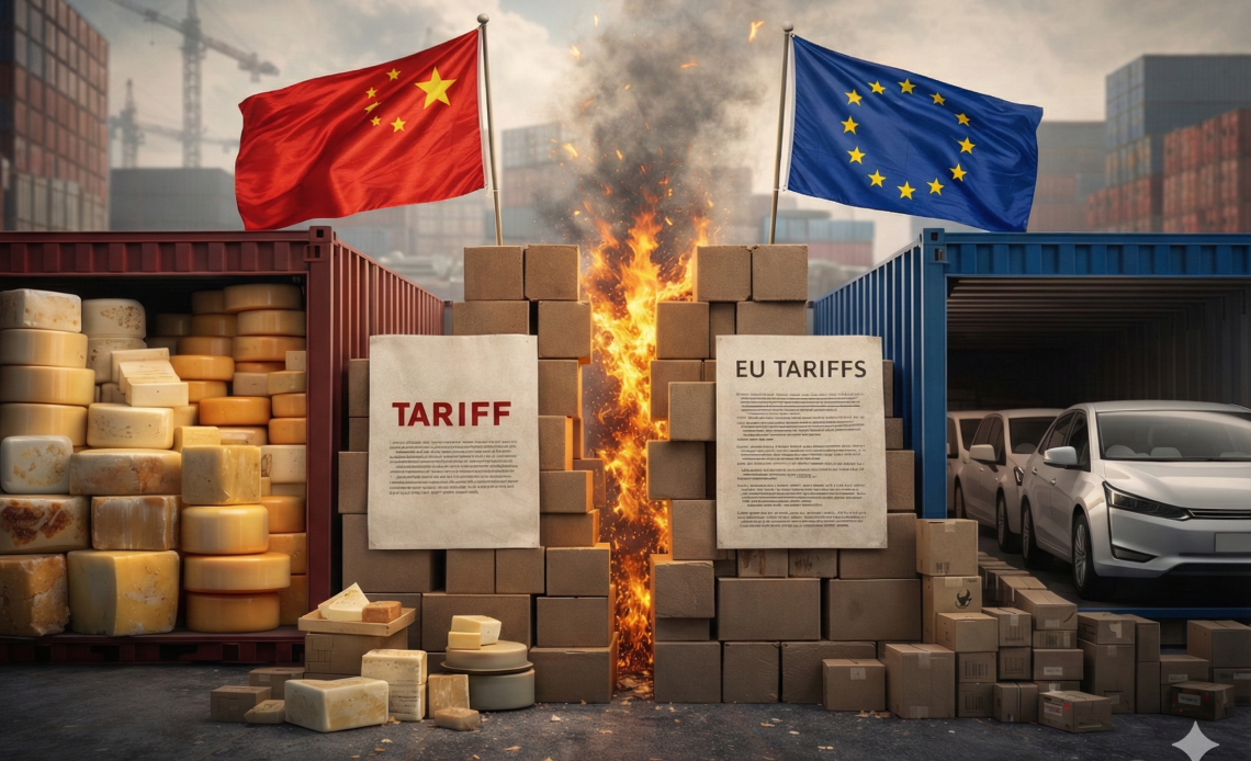 In the latest development in the series, China has imposed tariffs of up to 42.7% on dairy products from the European Union.