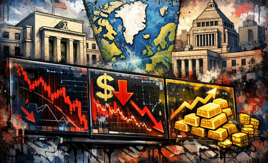 Moves in currencies, equities, and commodities reflected growing unease, while attention also turned to Japan’s domestic politics and renewed US-Denmark tensions over Greenland.